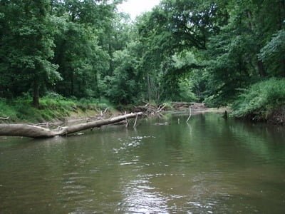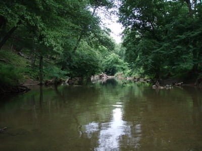 That said, this section of Great Seneca Creek continues the trend set upstream. The creek is reasonably wide and has a sandy bottom, so it is easy to walk in the creek. In fact, if you were going to teach someone to fly fish Great Seneca Creek would be a good place. Not only is the creek wide enough to minimize overhead cover that will snag a halting back cast, but there is plenty of sunfish to provide positive reinforcement on a well-delivered dry fly. While the creek bed does support easy wading, it continues to feature steep banks that require caution on entering and exiting the stream. There are plenty of downed structures in the river, providing ample holding locations for the teeming sunfish.