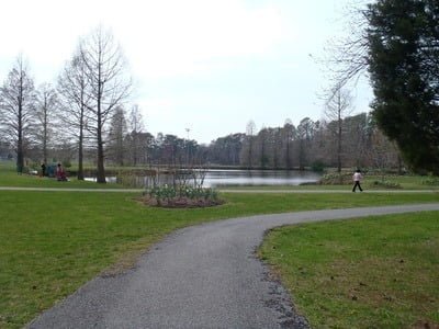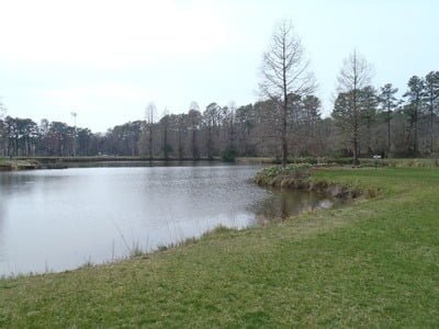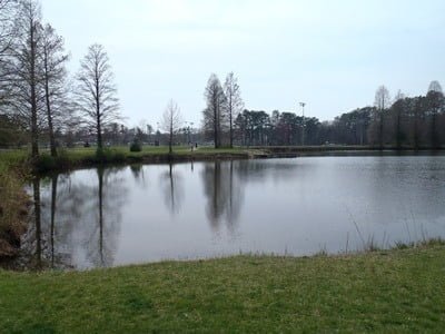Whether you park on the east or the west, the Henson Creek Bike Trail will take you to the southern edge of the large pond. Like most stocked ponds in the State, it has a well-manicured bank for easy access to fishing. Plenty of benches and picnic tables scattered around the perimeter allow you to add picnicking to the day’s activities. The west edge of the pond has a small fishing pier that juts into the lake.