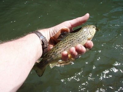 Recognizing the situation, I decided to move downstream when I hit the river and struck gold. Be sure you fish the broad pool 50 yards downstream from where the parking lot trail joins the river. The first pool is heavily stocked since the road from the parking area to the river’s edge is “stock truck compatible” all the way down. While trout will tend to migrate downstream within a week after stocking, they will hold in this pool until that migratory urge is triggered. Therefore, this is the place to target if you pay attention to the stocking schedule. In fact, when I was here in early April, I was able to stand in one place — by the fallen tree — and pick up five trout, one after another, on a green beadhead bugger. As a result of the success on the green bugger, I did not try nymphs when I was here.