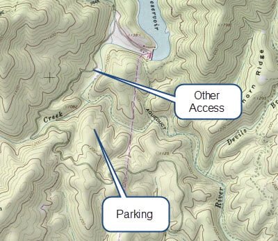 Getting There: Follow Route 60 from Lexington over the mountains and into the valley. Turn right on Panther Falls Road. It will turn into FR 315 (do not turn off to Panther Falls). It will turn into Reservoir Road towards the dam. Stay on Reservoir until you see the first sign for the delayed harvest area
