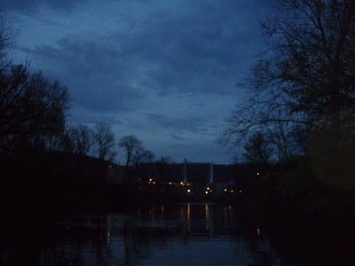 For the next hour and a half I pulled in 20 to 30 fallfish ranging in size from 5 inches up to 12. No trout — but any fish taken on top is a good fish. Once one Mr. Rapidan was ripped up by their aggressive behavior and my other offered up to the tree gods, I switched to a similar sized Adams and continued to have plenty of fun and action. Even though you are surrounded by a town with factories spewing white smoke, squint a bit with the glare of the street lights and have to ignore the roar of cars rumbling across the bridge, the river itself runs placid and calm. As I waded up from the bridge, I noted the bank on the east side seems to support most of the structure. The river runs from shallow on the west to fairly deep – 3 – 5 feet on the east with the depth increasing the father up I went.