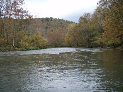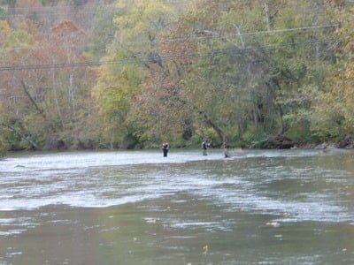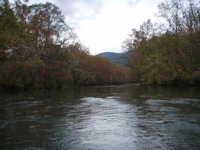 My short visit was enough to get a sense of the river. It was a little tighter than Smith Bridge, offered equally good structure, and was easily wadable. The riverbed looked like it had more rock ledges and fewer boulders than the area around Smith Bridge. Please take this with a grain of salt since, given the clouded condition of the water, I could not get a clear view of the bottom. Instead, I’m reporting on what I could feel with my feet shuffling upstream. Unlike the eastern Virginia Rivers like the Rapidan and the Rappahannock, there was no sand in evidence anywhere. The bottom was totally rocky, which bodes well for fantastic insect density. On this late October day, the water was running a crisp 55°.