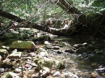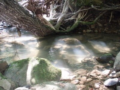 A little bit up the stream and the water appeared. There is probably a very gentle flow from various springs, but the water was hardly moving on the day I was here.