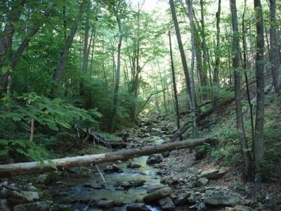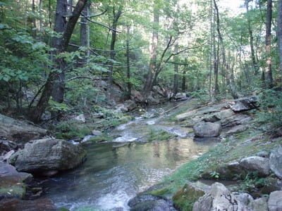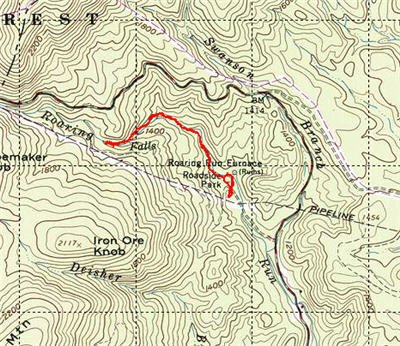 Getting There: Navigate to Clifton Forge. From Clifton Forge, go south on 696 (Rich Patch Road). It will dead end into 621 (Roaring Run Road). Turn left. Follow 621 for a few miles until you see the sign marking the entrance to the park. Turn left and go to the end. The trail is through the picnic area.