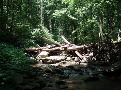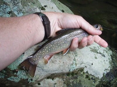 Granted, I’m 57 and I’m lucky to be in shape to do this type of a hike but this would’ve kicked my butt at 30. The trail winds its way down a gentle gradient until you reach the falls. Here the trail takes a dramatic pitch straight downhill as you navigate tight switchbacks that go directly down the face of the mountain. Once you reach the bottom of the falls, the trail levels out but continues its torturous downward pitch. We breathed a sigh of relief as the trail finally leveled off in the valley floor. We passed a group of campers and asked them if they had been fishing. They told us that they had not but had seen plenty of fish when they walked by the Doyles River Falls around the corner. It turns out that “around the corner” is about a half mile up from the confluence of the Jones and the Doyles. We decided that we wanted to fish the higher volume of water that would be downstream of the confluence so ignored the upstream guidance and started to bushwhack our way downstream. Once you leave the trail, there is no trail — pretty obvious statement.