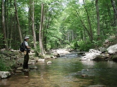 Hughes River Trout Fishing Bottom line: If you’re going to fish the Hughes or anywhere else in the park, do it within the next couple weeks before the water warms up. It was running a brisk 60 agrees on this day but as the water temperature increases the fish will become stressed. You should avoid fishing in the park in the heat of the summer to protect these delicate fish. A final point is that if you are going to stray from the trail, you need to be in shape. At 57, I’m grateful that I can still go where I go to get to the fish. This event today involved 7 miles of hiking, jogging and bushwhacking with a total vertical gain of over 600 feet!