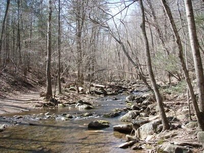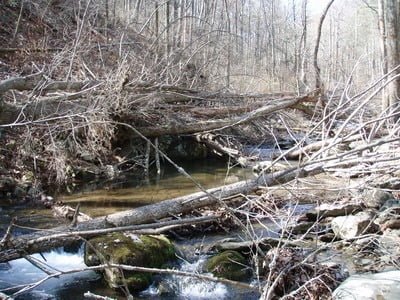 My continuing beef with the VDGIF stocking plan is that it is not specific about how to reach stocked water. The South Fork of the Moormans was no exception. Looking at the Trout Area Map for Area 2, you see the short squiggle at the upper left end of Sugar Hollow Reservoir. With that as the only thing to guide me, I concluded that I had to cross the North Fork, which joined the reservoir at the upper right, and move south around the lake.