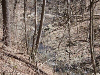 About a mile upstream, I realized that this was a losing proposition. I could see a line cut high on the hillside above that I concluded was the road; I wished I had remained on that path. Since the road ran west and seemed to follow the stream, it had to be how the stock truck would get back to do its duty.. Looking for an easy way out, I staggered up the hill and was happy to poke my head over the crest and see the roadbed loom into view. A few hundred yards later, the road and the first of several “stocked trout water” signs appeared. Unfortunately, the character of the water did not seem much better up in this area.