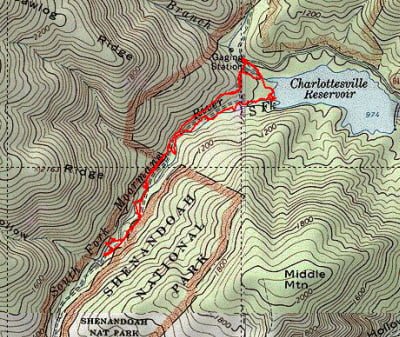 Getting There: From I64, take exit 118B onto Rt 29 north. Get onto Rt 250 west at Ivy Road. Turn right onto Brown’s Gap Turnpike (Rt 680). It merges with Rt 789 and then “T”s into Garth Road at White Hall. Turn left and follow Garth Road until it makes a sharp right bend at a small gas station. Turn left at the bend onto Sugar Hollow Road (the gas station will be on your right as you pass it). Follow Sugar Hollow Road all the way to the parking lot at the north end of the lake.
