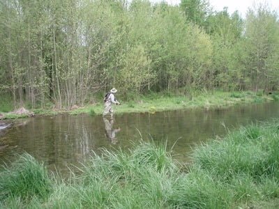 Doug has made extensive improvements to the river. While it runs fairly flat and shallow elsewhere in the valley, he created small pools to hold the fish which are separated by 15 to 30 yard riffles to ensure plenty of aeration. In addition, all the banks are improved with rock walls where appropriate. It was pristine, yet still challenging as there are some trees that make casting sporty.