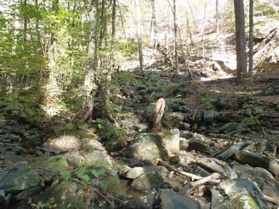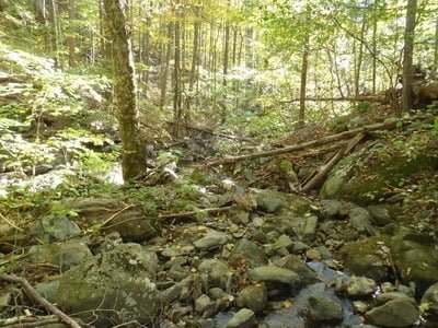 I have to admit that we were disappointed as we walked to the turnaround point where we would begin to fish our way back upstream. We would anxiously look over at the stream in hopes of seeing deep water and frequent pools such as exists on the Rose River or the upper Hughes. Sadly, these are few and far between. After starting fishing alongside the actual streambed (avoiding stepping in the water because of the impending spawn), I was totally bummed out. Most of the places that I fished were 3 to 4 foot wide spots with none of the runs between them being productive. We did pick up a few decent size brookies where we could find a pool that was the least 3 feet deep, but most of what we ran into were very small, four-inch long brook trout. In short, not a lot of payoff for the grueling hike to get here.