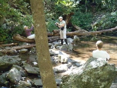 We decided to fish upstream from the junction to see if the water would be different and to determine if we could get to that tantalizing pool we saw from the overlook. As we staggered up the steep pitch to reach the falls, we were feeling fairly grizzled and manly that we were tough enough to deal with this hike at the ages of 58 and 57. Comments about fat classmates who let themselves go bounced back and forth between us. Well, the joke was on us! As I sweated up the last steep pitch to reach the base of the falls, I saw three elderly ladies arrayed around the pool taking pictures and chatting. So much for macho! Unfortunately, that pool was not the one we were targeting and I asked the ladies if they knew if the trail continued up and around the steep cliff that the secondary waterfall coursed over. One said that her daughter had literally climbed up the cliff earlier in the year to get to the top (another blow to my male ego), but did not recommend it as a sensible thing to do. I agreed and threw a few flies into the pool without producing any results.