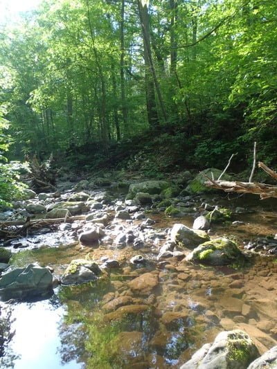 Continuing up the trail, it transitions into a general uphill rise that eventually drops back down to cross the river. At that crossing, there is a “good” (it’s all relative) pool so I decided to start my fishing at that point. The stream crossing is approximately 2 miles from the trailhead and I’m sure the pressure evaporated with every step I took away from the truck. That conclusion was immediately reinforced by the brook trout in the pool. I crawled up the left-hand bank, extended my Tenkara rod and began casting the light furled leader terminating with 7X tippet into the gentle current that ran against a large boulder on the other bank. Bang! An 8 inch brookie. Clearly, this was the place to be. I was using a size 18 blue wing olive and continued to get hits as I hunkered on the edge of the pool for a half an hour. I decided that this would be as good a place as any to begin my trek up the river bed and began dancing across the small boulders and dodging fallen trees to move upstream.