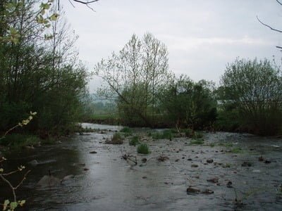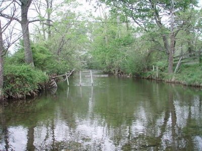 This is a scenic stream to fish. As you work your way downstream, you see broad green pastures on the western side and the road is hidden from your view to the east by thick bands of bushes and trees. The river winds its way down through some shallow riffles protected by thick overhanging bushes and trees that make casting problematic. In fact, the farther downstream I went, the shallower it got. I knew from my experience on the upper portion of the section I had fished earlier that it petered out into a shallow run so I stopped and retraced my steps upstream.