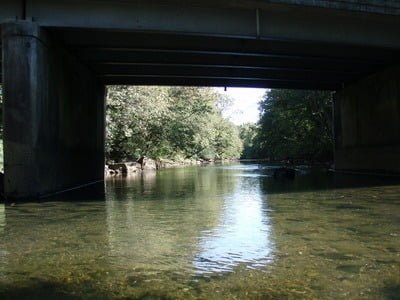 Access to the river is easy. There is a well-worn path on the right side of the bridge. A few hops on some rocks and concrete blocks, and you find yourself in the river looking upstream at some nice water. Like the Trenthill bridge, the river is reasonably wide here – maybe 30 feet. The bottom is a mix of sand and rocks. I discovered as I moved downstream that the character of the bottom slowly changes from rock to stand. This spot was a transition area and the downstream stretch looked like it was even more sandy in comparison.