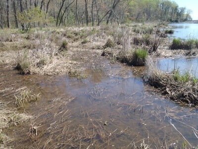 One of the first things to note is that this fish does not move into shallow water until April. Well, I ignored that in my eagerness to start looking for these fish and headed down the Quantico to see if I could walk the bank of Chopawamsic Creek, fish from shore and determine where these guys hang out. My first instinct was to follow the path leading west from the parking area since it generally parallels the creek. My plan was to move along the path and then cut south to intersect the creek away from the launch. As you can see, I did not get very far. Once off the path, I was into knee-deep muck that gripped the bottom of my wading boots to the extent that I became concerned I would sink and be stuck. Discretion being the better part of valor and not wanting to suffer the embarrassment of having beefy Marines pull me from the mud, I retreated to the path and, once across a small bridge, I veered south using the firm ground next to a diminutive feeder creek to reach the bank about 200 yards upstream of the launch point.