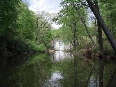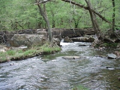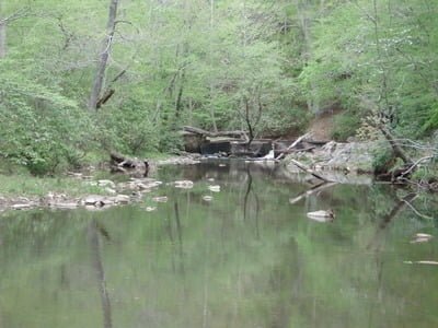 Be sure you get a base fishing permit before you fish on Quantico. I already had one, so I dove right in and turned off on the dirt road. There will be a number of fords across the creek as the road cuts across the bends. All the fords are concrete and will not present a problem – even to a flatland car – except if the water is very high. I doubt that ever occurs since the flow is from the Breckinridge Reservoir and is probably controlled to match the water level in the dam. Sadly, this is not a tailwater which would have a trout friendly cold flow. Instead, the water dribbles over the top, getting baked on the concrete face of the dam and splashes tired and exhausted into a stagnant looking set of pools under the dam.