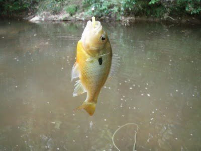 I started fishing down the stagnant looking pools with no luck on woolly buggers and then switched to a yellow trout magnet when I hit the stream part. It immediately attracted the attention of every bluegill within hailing distance and they lined up for a turn at snapping at it. Hey, this was turning into fun. I realized that while I would not get any trout here, I would get some good casting practice and enjoy the tug of some fiesty little guys.