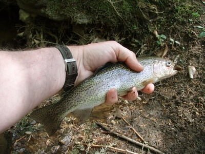 The stream is closed in by trees that close out the sun. So, it was reasonably cool as I waded down the stream, looking for spots that were at least a foot deep to entice a bluegill into snapping. I continued this down to the end of the red line on the map. That’s where I stumbled across a larger, deeper pool – probably the best one on the creek and within two casts had actually landed a trout! He was probably the last one in the creek and committed suicide out of loneliness – but I did not complain.