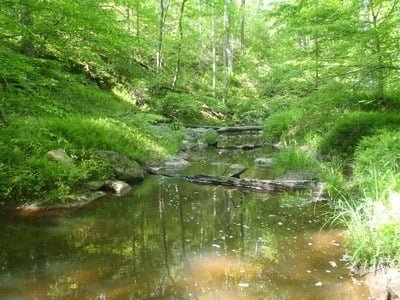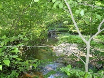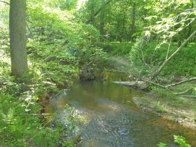 The first thing I look at when checking out a newly stocked section is whether the stocking truck can access the stream. Frankly, the poor stocking people will not haul a couple of fish more than a few yards to populate the stream – it’s just too hard. Starting from the west, there was reasonable access for the first 25 yards of the stream, but then a ravine cuts off further easy progress. I continued east and saw a faint road that generally parallels the stream. I assumed that the stocking vehicle could get access via one of the closed gates I had seen on the way in. However, this entire section is suspect because if that is not true, it will not be heavily stocked beyond easy-to-walk two areas near the kid’s fishing area. The fact that there were plenty of “stocked water” signs posted to the trees was encouraging – there are fish dumped into the stream.