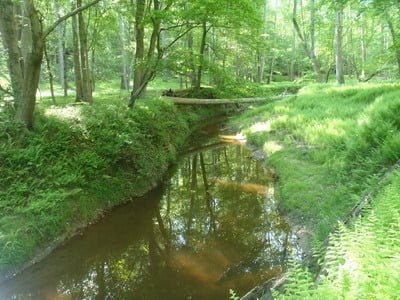 Immediately downstream of the pool, the stream looks reasonably trout friendly. Although it runs over a sand bottom, there is enough fallen vegetation and a few deep holes to provide holding locations. The farther east you walk, the worse the stream becomes. The banks are precipitous and high, looming 10 to 15 feet above the water. The only way to fish is to wade in the stream, and it may be a while before you find a place to exit.