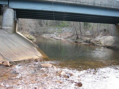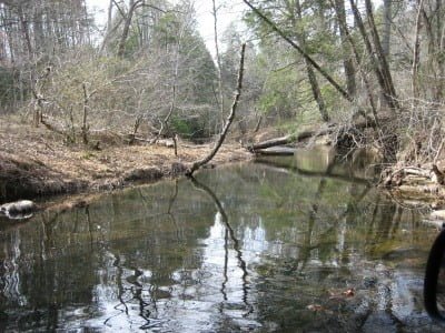 As you can see from the map, the stream is located just off exit 148 on I95. Get off heading west and immediately leave the road on a small dirt road to the right – not more than 50 yards from the exit ramp. If you go over a small bridge, you have gone too far. The stream just does not look impressive – it’s more of a flat running wide and shallow creek. I would bet that most of the trout stocked would die of heat in the summer except for the fact that the stream is fed from the runoff from the Reservior – hopefully, that’s coming from the deep end where the water would stay colder and not just the spillage over the top of the dam.