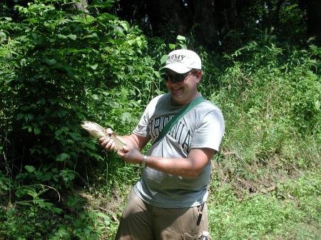 We started as indicated and immediately had good luck! Nice fish – popped him back in the water immediately – the requirement here is that fish be over 16 inches to keep. We slowly worked our up the creek – pretty good action – but nothing worth keeping until we got up to the bend in the creek marked on the map (“monster caught here”). Chris laid into a really nice fish as shown below – if we were not practicing catch and release, he would have been a keeper.