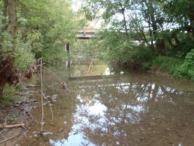 I slid down the steep bank from the road on the left-hand side of the bridge and was immediately disappointed with the quality of the late summer water. My assumption had been that since this was spring fed, the flow should be pretty robust all year around. Instead, all I saw was the murky, slack water full of silt washed down from the farms upstream.