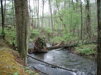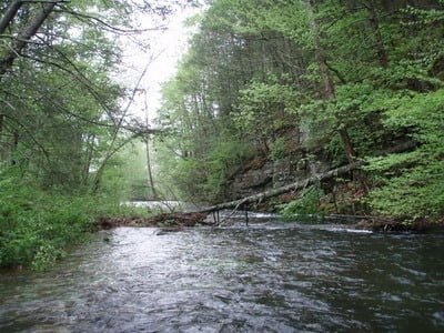 Two hours later, I crested the hill from West Virginia, anxiously peeking over the side of the mountain to get a glimpse of the Skidmore reservoir and looking for the turn-off. I had been here once before, in January of 2006, on an uncharacteristically warm winter day to do a recon. At the base of the hill, I found the turn and drove up to the trailhead, where I encountered a group of college kids who had picked the wrong weekend to go camping. I’m not sure who looked more like a wet dog – was it the kids or the wet dogs they had with them? But the Skidmore Fork running next to the campsite was clear and free of the silt and mud. It looked a little high, but I figured it might dissipate higher up. After all, I had not been beyond the campsite on my earlier trip and did not know what to expect in terms of either gradient or pools.