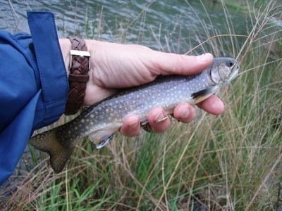 My trek was rewarded as I broke out of the forest and stared into a broad clearing that formed the base of the Dam. Looking around, I felt like I was out west. The river in this section was broad and gentle as it had not yet picked up any velocity running on the flat stretch. This is what I was looking for on this miserable weekend. I had already rigged up my fly rod with a pair of nymphs, so I began to fish with them. On the third cast, I was rewarded with my first hit. I set the hook like a pro and brought a nice brookie to hand. As I worked up the stream, I continued to get hits, but did not actually succeed in hooking any additional fish. When one of the brookies hit my indicator, I switched to a dry fly. The Adams I tied on instantly attracted attention from the fishy population. I picked up two additional brookies using this, and then things quieted down. Figuring this was my opportunity to do a triple play, I tied on a Patuxent Special and took a shot at seeing if anyone was interested in a streamer. Surprisingly, I was rewarded and brought an additional brookie to hand.