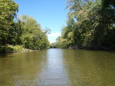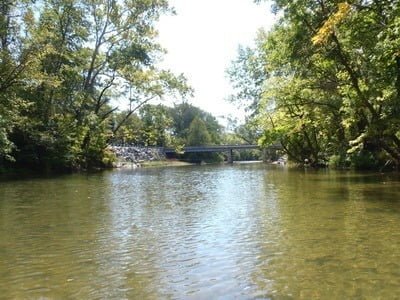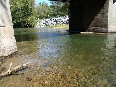 I rumbled across the bridge and swung to the right into the broad parking lot next to numerous picnic pavilions. This was a nice little park! Even in mid-September, it still had portapotties in place and I could see the grounds crew mowing the grass. After eating a sandwich, I wandered over to look at the water. It was crystal clear running across a mostly rocky bottom. Good so far!
