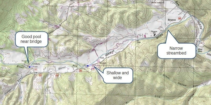 The first leg runs from the junction with the North Fork up to a bridge where Rt 826 crosses the German. That stretch is narrow at the east and becomes broad and flat by the bridge. Upstream at the next bridge crossing in Criders, there is a bend that has a nice 3-foot-deep pool. From that point, the river begins to get on private property and the stocked water signs disappear.