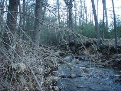 I stepped down the low bank and stood on the edge of the creek, and did my usual visual recon up and downstream. It looked as I expected. The creek had plenty of water- nothing to distinguish it from any of the streams you would see in the Blue Ridge watershed. The bottom was totally rocky, with no sand, and numerous boulders provided a scenic backdrop to the creek. One thing you need to be aware of if you fish brookie water during this time of year is to avoid stepping in gravel due to the spawn. If you fish at this time of the year, you must resolve to rock hop and stay out of the water. The stream bed was wide enough to make this easy, although I cast an anxious glance at all of the trees that grew over the creek, which would make fly casting problematic. I brought my short rod with me in anticipation of a close fight and started to assemble it.