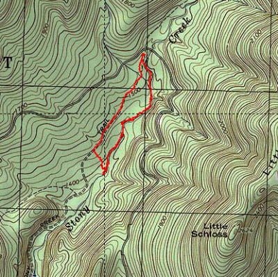This location is easy to find. It is a short drive north from Columbia Furnace to reach the start point. The dirt road leading to the medium-sized parking area is compatible with flatland cars; no 4×4 is needed. I pulled into the parking lot at 0800 and was surprised to see three other cars ahead of me. I had a brief moment of panic and then remembered that we were still in hunting season and the chances of these people being here to fish the small water that Little Stony Creek was remote. I did put on my blaze orange hat and vest before I ventured down the well-marked trail. I’d rather spook a fish or two than NOT spook a hunter! The map shows the path I followed. I walked down the trail about three-quarters of a mile before I cut east to bushwhack over to the creek. It was tough going through the undergrowth and I was glad I had my garden shears with me to clip my way through.