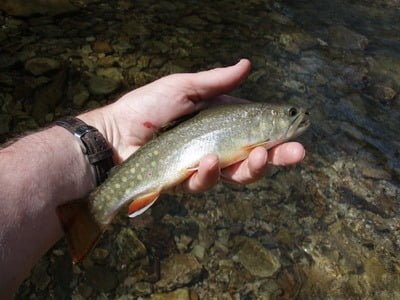 The trail follows the river all the way up. I only walked in 1.6 miles and did not go all the way to the falls since I had to get back early. I’m told fishing is good in the vicinity the falls as well as above it. That said, there’s plenty to enjoy in the first 1.6 miles. I decided to put some distance between myself and the parking lot and did not start to fish until I was a half mile in. At that point, there are a series of what I initially thought were pools. Some are and some are not. The light plays tricks that capitalize on the crystal clear, flat nature of the river in the few places it drifts across a level section. With many pools, once you approach cautiously by balancing precariously across the boulder strewn stream bed, you discover that it is a shallow run. However, they are worth fishing as well. Even the shallow runs have a deeper course at some point where small brook trout will hold; look for the slightly darker shade of water that indicates greater depth.