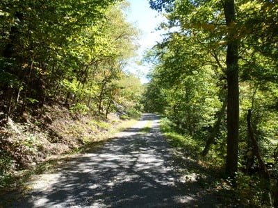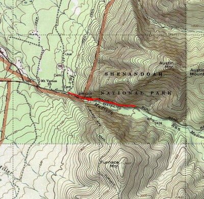 Hart’s directions are good and will deposit you at the edge of the Shenandoah National Park at at the end of a fire road. As you drive up towards the Park, pull off in the last wide spot before the fire road begins to closely parallel the stream with high bank on the left-hand side. If you drive all the way to the gate, you will encounter a “no parking” sign and no place to turn around. I ended up having to back up the hundred yards back to the wide spot.