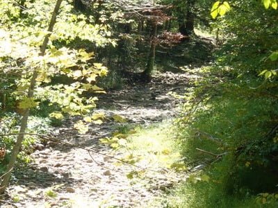 Sadly, bikes are not permitted even though the fire road is broad and level. My hope/guess is that water reappears up next to the steep slopes of the western Blue Ridge – but walking a mile without seeing him anything was as far as I was willing to go and represented as much energy as I was willing to invest. After taking a last pathetic picture of the dry stream bed at the top of my walk, I hung my head and headed back to the truck.