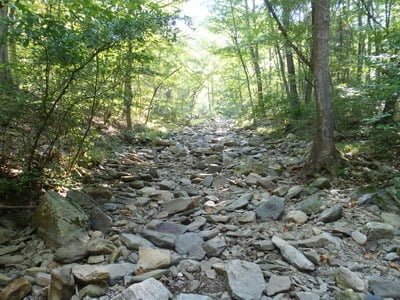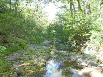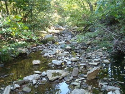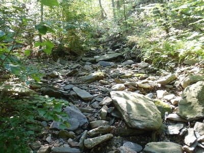 Periodically, I stopped and listened for the stream. I uniformly failed to hear it, but, after 20 years in the field artillery, that’s not saying much. I had a few glimpses of the creek from the trail and continued to be disappointed. Finally, with some sweat dripping off my brow, I reached a final stream crossing and decided to give up the ghost. I was about 1,5 miles from my truck and nothing was in the streambed – absolutely nothing. There was a damp sheen where the moss had overgrow some of the rocks but beyond that, nada.