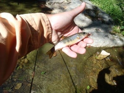 After walking about 15 yards upstream, I saw what looked like a deep spot and flipped a small grasshopper up into the center of the pool. Immediately, I had hit. And it wasn’t one of the small fingerlings, this was a 5 to 6 inch trout. I missed him on the first flip, but got him on the second. After carefully releasing him, I walked up to see how he could survive in water so skinny. First of all, I measured the temperature and it was a robust 60° – not bad for mid-September. Second, the pool was approximately 3 feet deep at its height; tapering off to a flat rock shelf. Therefore, this guy could survive huddled in the deep; waiting for anything to float by. I also noticed plenty of fry swimming around and assume that those provided the bulk of the larger fish’s diet.